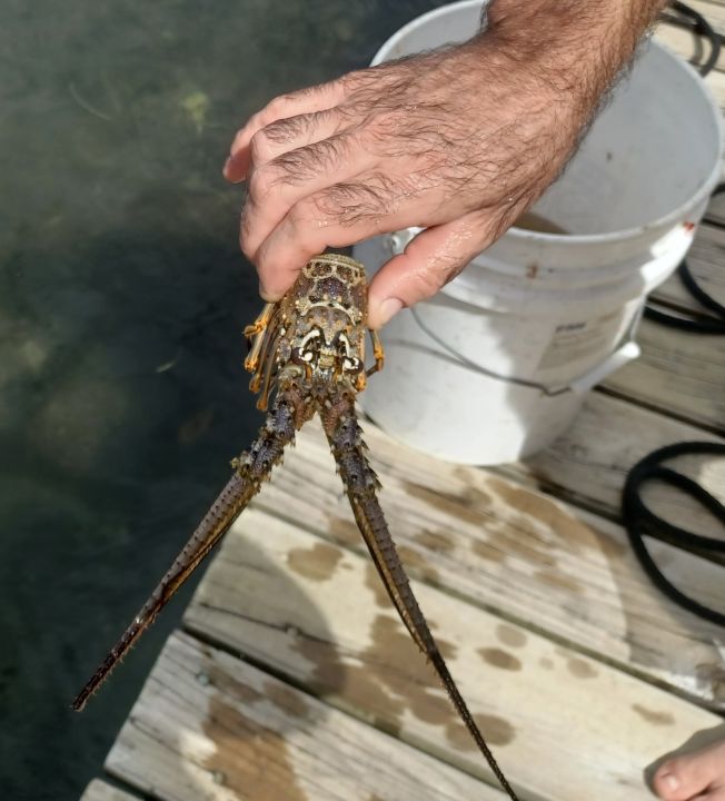 To catch one, you use the blunt end of the snare stick to nudge the lobster out of its hole, then quickly slip the loop over its tail and give a sharp tug to cinch it tight. Into the catch bag it goes. This is very simple in theory, much trickier in practice.