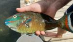 I hired two men from the village to teach me, and we set out in our boat. They showed me how a harpoon is crafted and how to use it properly. This is a fairly straight stick with a sharp metal point and an elastic rubber tube on the back end. The tube wraps around your wrist and gets stretched tight. When released it rockets out to stab the fish. Aiming underwater takes some practice. It's a little more difficult than simple point and release.
