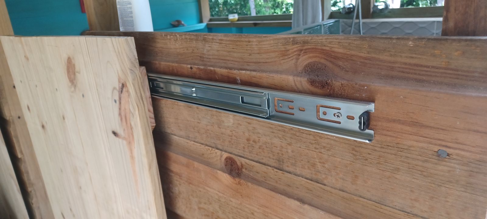 I realized that I could make use of a couple extra drawer rails from the kitchen build. I glued and screwed some 1x6 planks and mounted them on the drawer runners on each side of the entry. Pulling them together gives great privacy and it won't blow around in the wind.